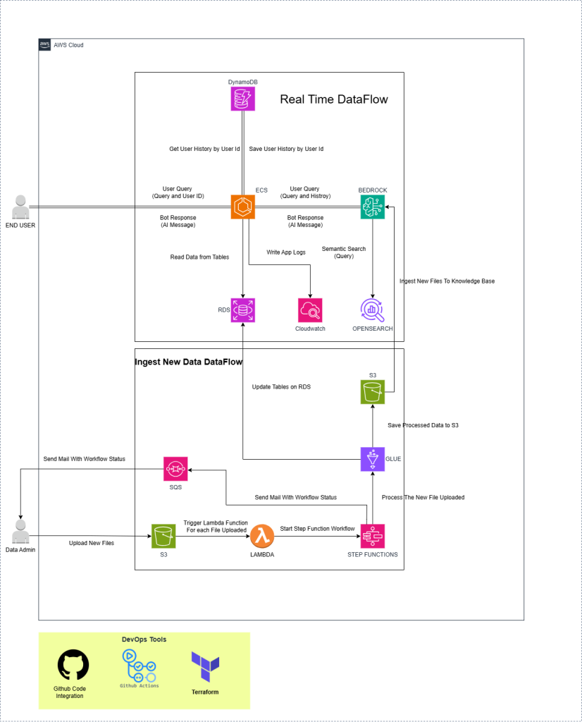 User Query Processing:ECS handles queries with DynamoDB history & Bedrock/OpenSearch semantic search